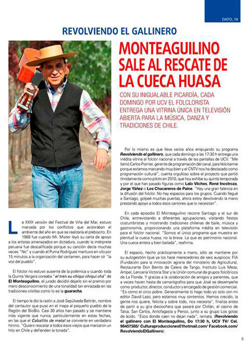 El Monteaguilino ha colaborado con otros grandes nombres de la música como: El Clavel, René Inostroza, Sinergia y otros, contribuyendo a mantener viva la música tradicional. Además, ha participado en proyectos en la televisión chilena conduciendo su propio programa “REVOLVIENDO EL GALLINERO” a través de RED TV y posteriormente en Caravana TV y actualmente en su propio Canal de YouTube, manteniendo la música folclórica chilena y sus tradiciones.